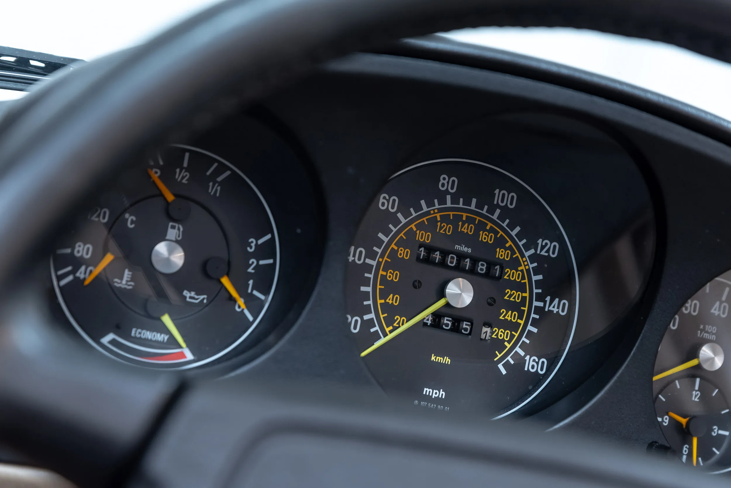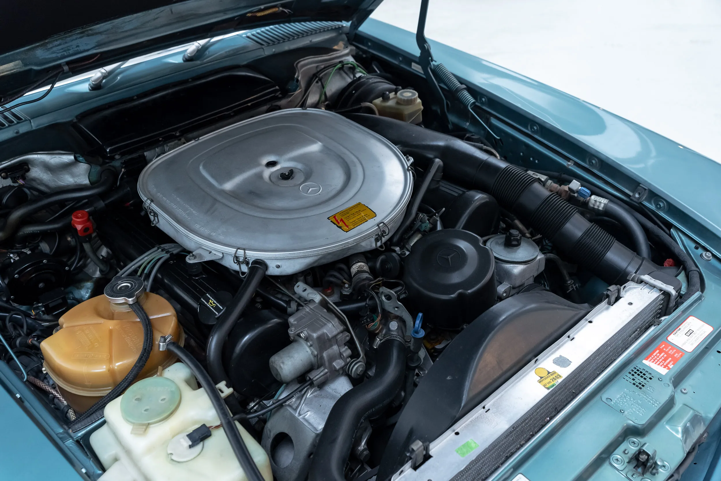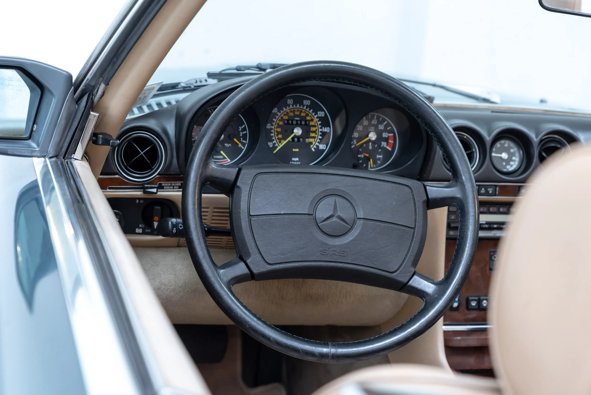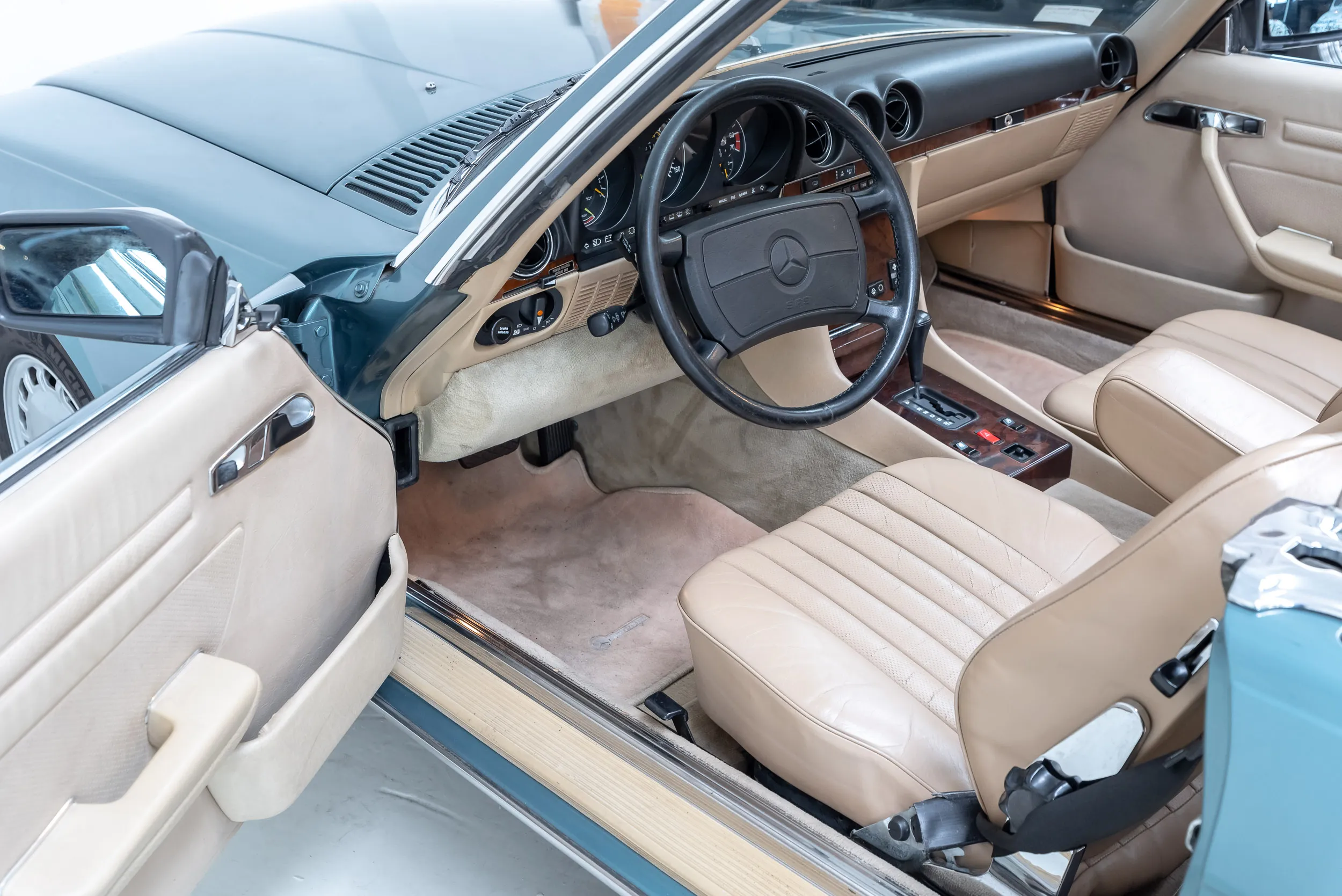 يأتي مثالنا هذا من كاليفورنيا وهو موجود على الأراضي الهولندية منذ هذا العام فقط. هذه السيارة "Golden State SL" في حالة جيدة جداً، ولا يزال الطلاء أصلياً تماماً. وهذا يسمح لنا أن نقول بكل تأكيد أن سيارتنا W107 ليس لها تاريخ تالف. لم يكن المالك الأول متواضعاً في خيارات التجزئة، فقد تم تجهيز R107 بما يلي:
