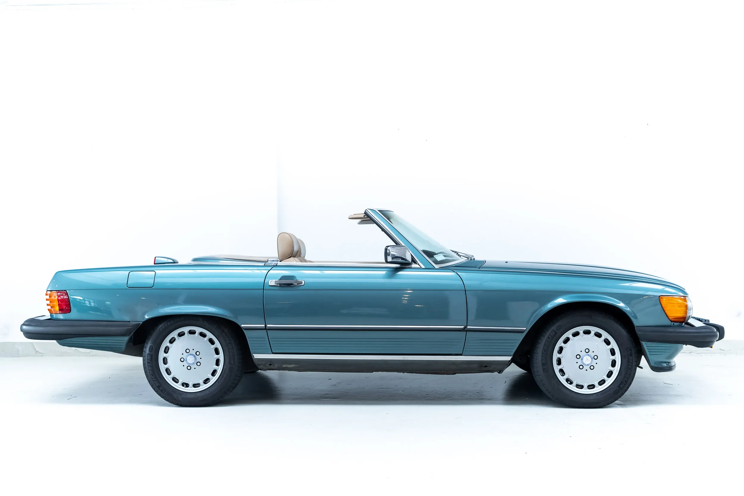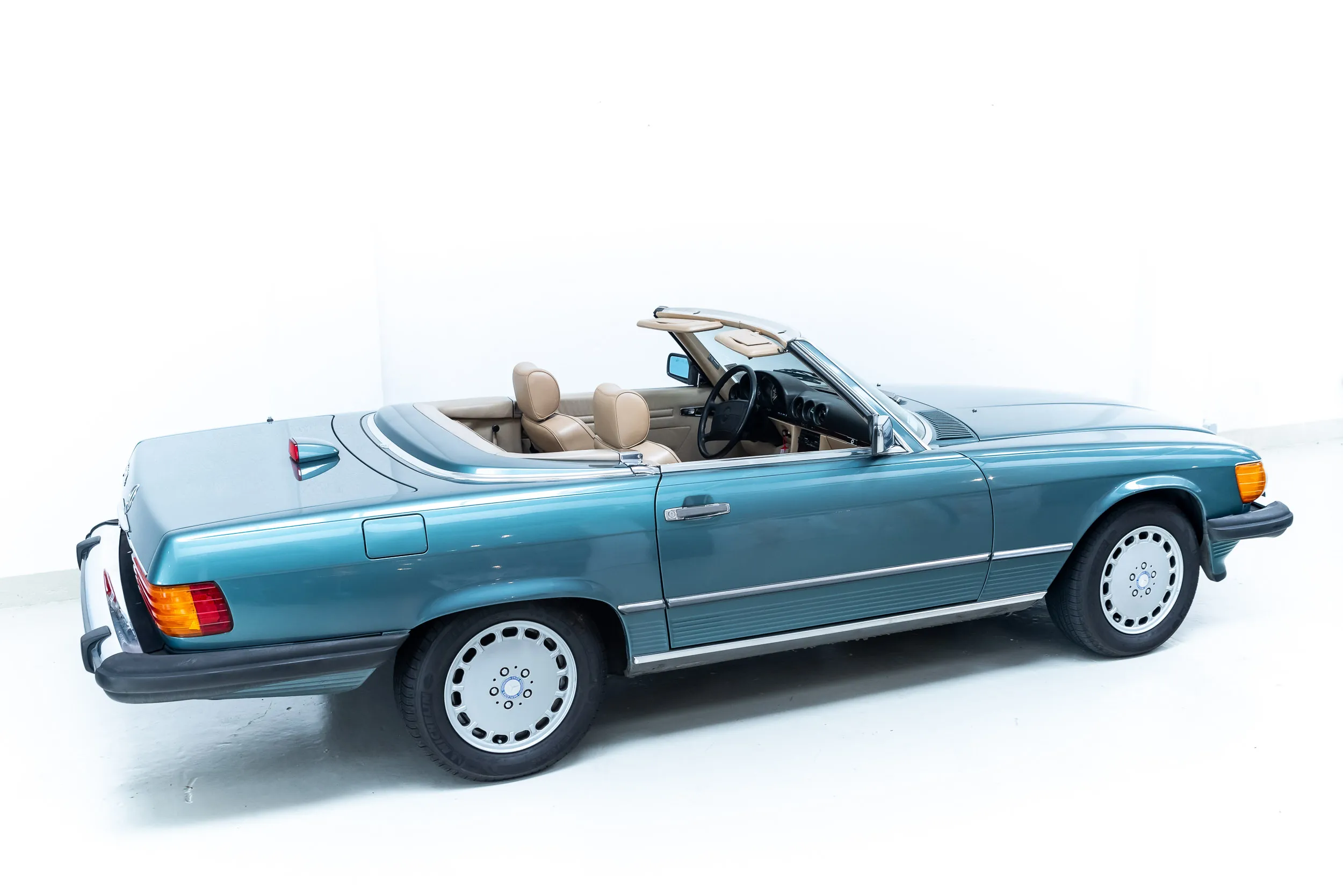 سيارة مرسيدس-بنز 560 SL أصلية بالكامل بلون أزرق-أخضر معدني مع 110,000 ميل فقط. 560 SL هو أكبر محرك تم تسليمه في سلسلة W107 SL. كانت متوفرة فقط في أمريكا واليابان وأستراليا.