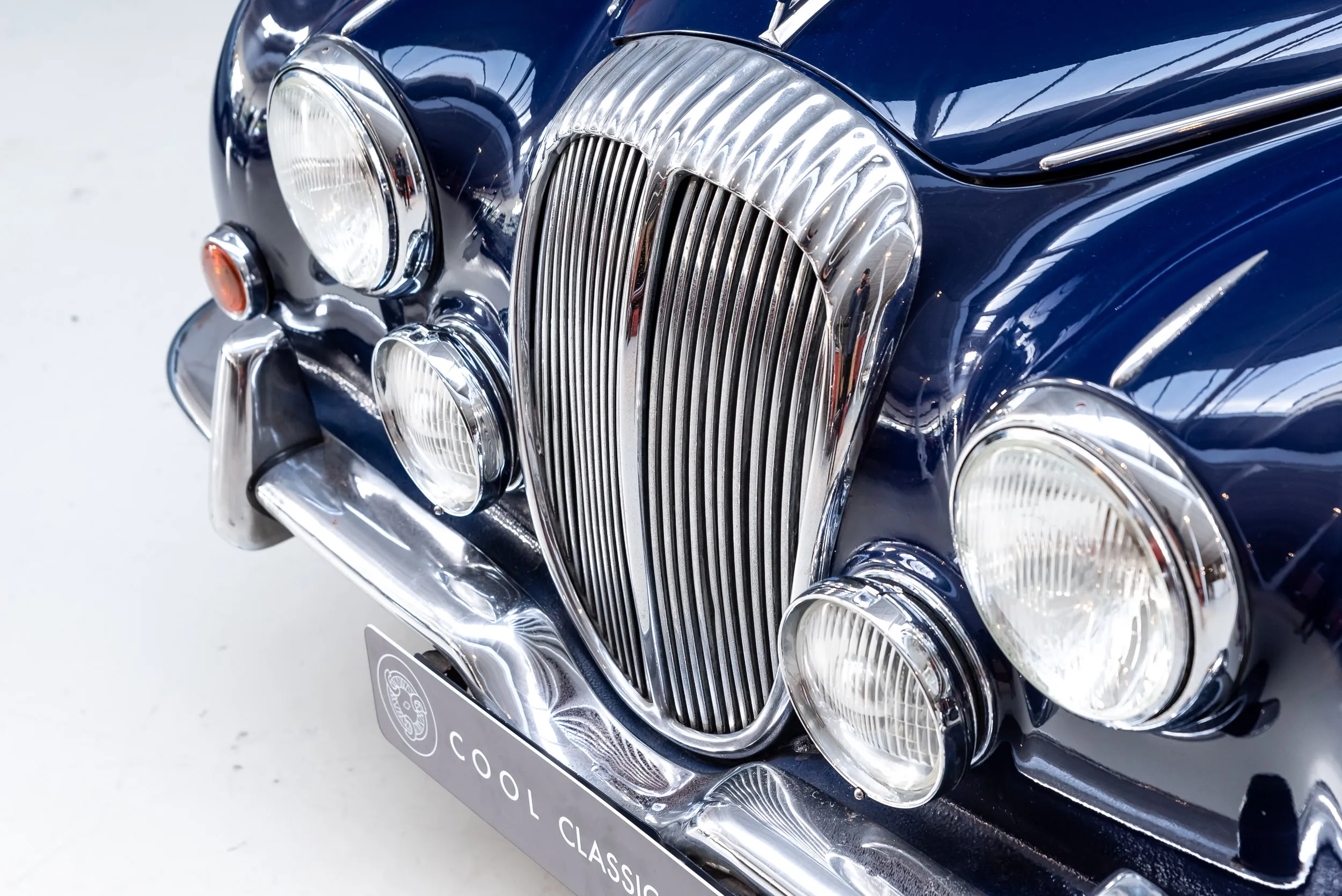 Front oblique view of the 1968 Blue Daimler V8 250