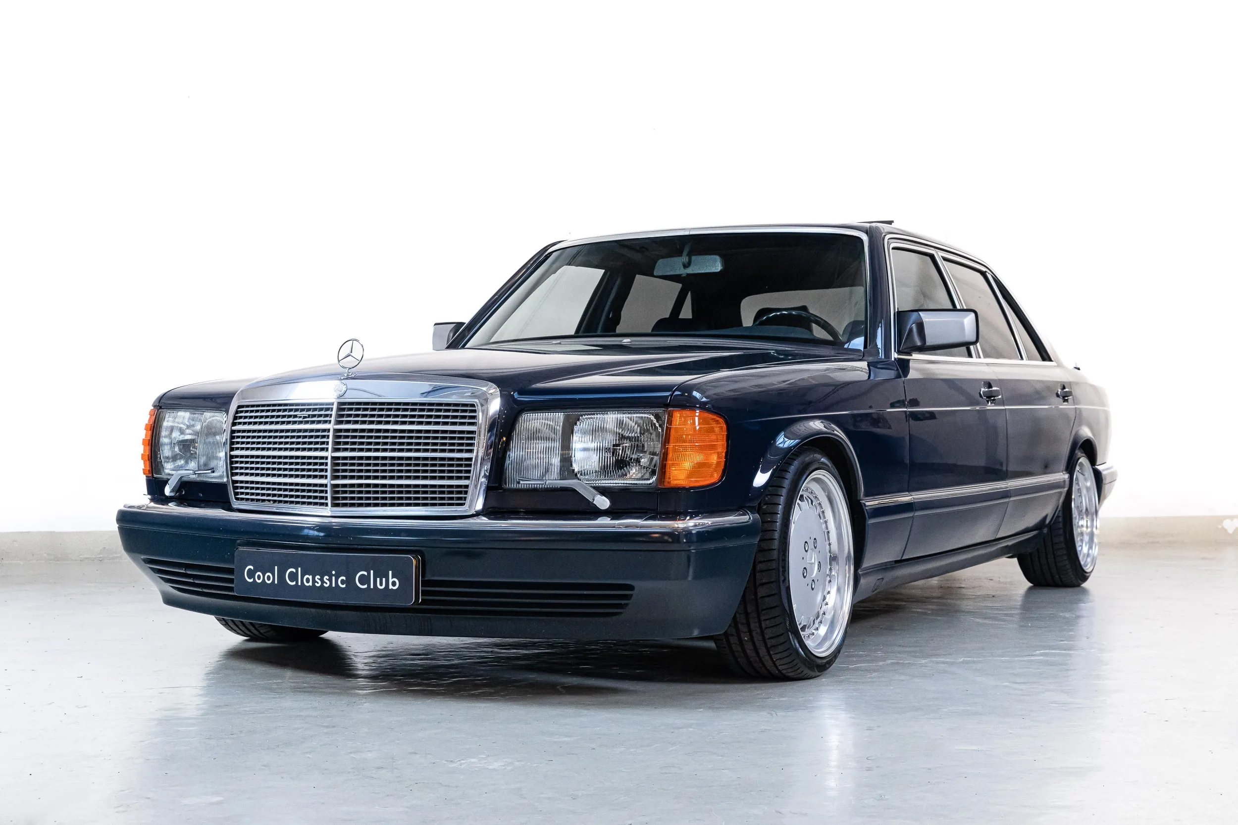 Ours? As you are probably used to. Completely original and unrestored. Dark blue on dark blue, sliding roof and no options. 96 thousand kilometers and fully dealer maintained. The previous collector, we think, finished her off completely. The original rims are made by hand in three parts and her chassis is equipped with air bellows. Fully independently controllable and adjustable. Had over 4000 watts of audio installed and everything 'hidden' in the spirit of the times. End result? The only W126 with humor. See you soon?