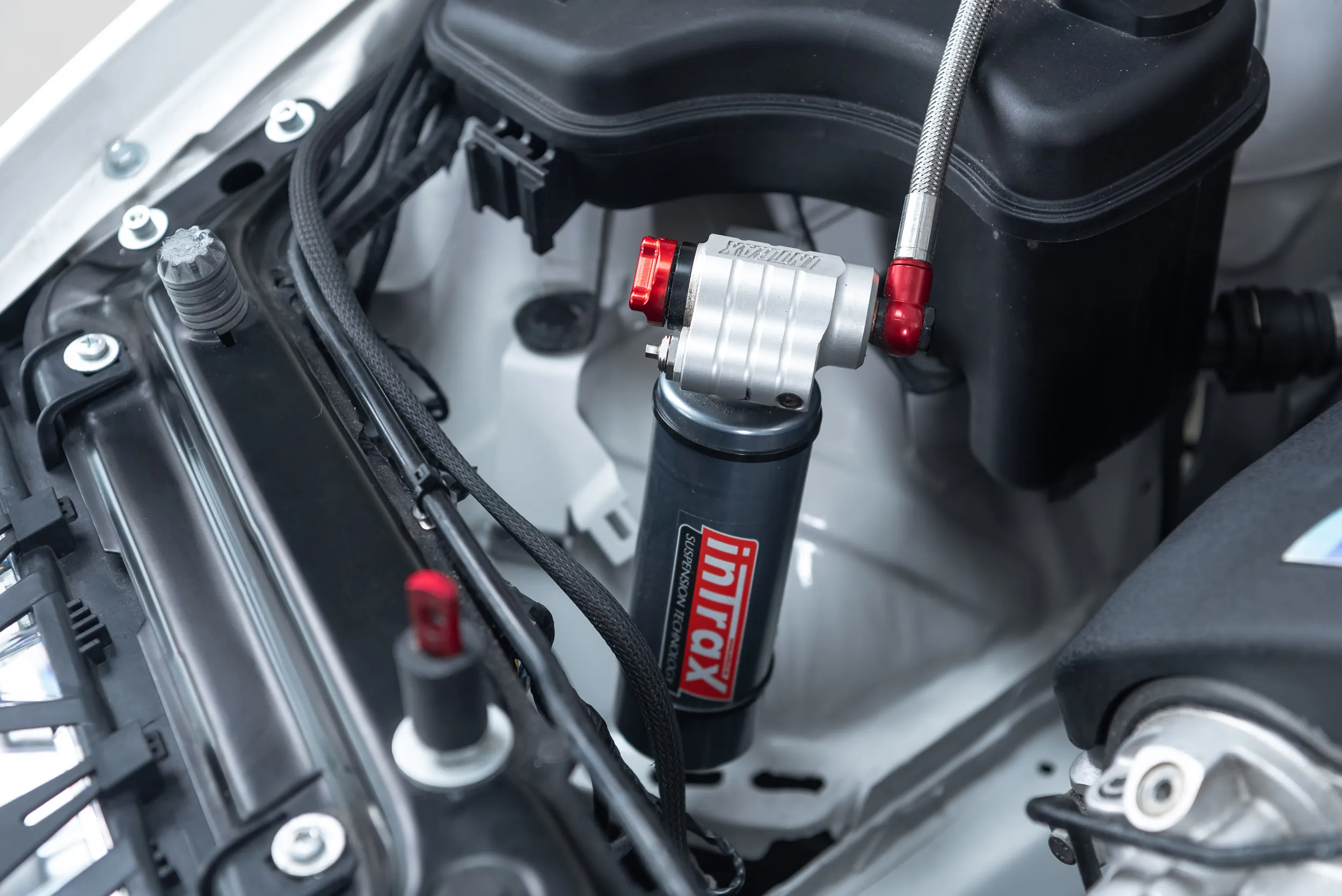 3 Luftheber von Intrax sind installiert, um das Fahrzeug bei Wartungsarbeiten und Boxenstopps anzuheben.