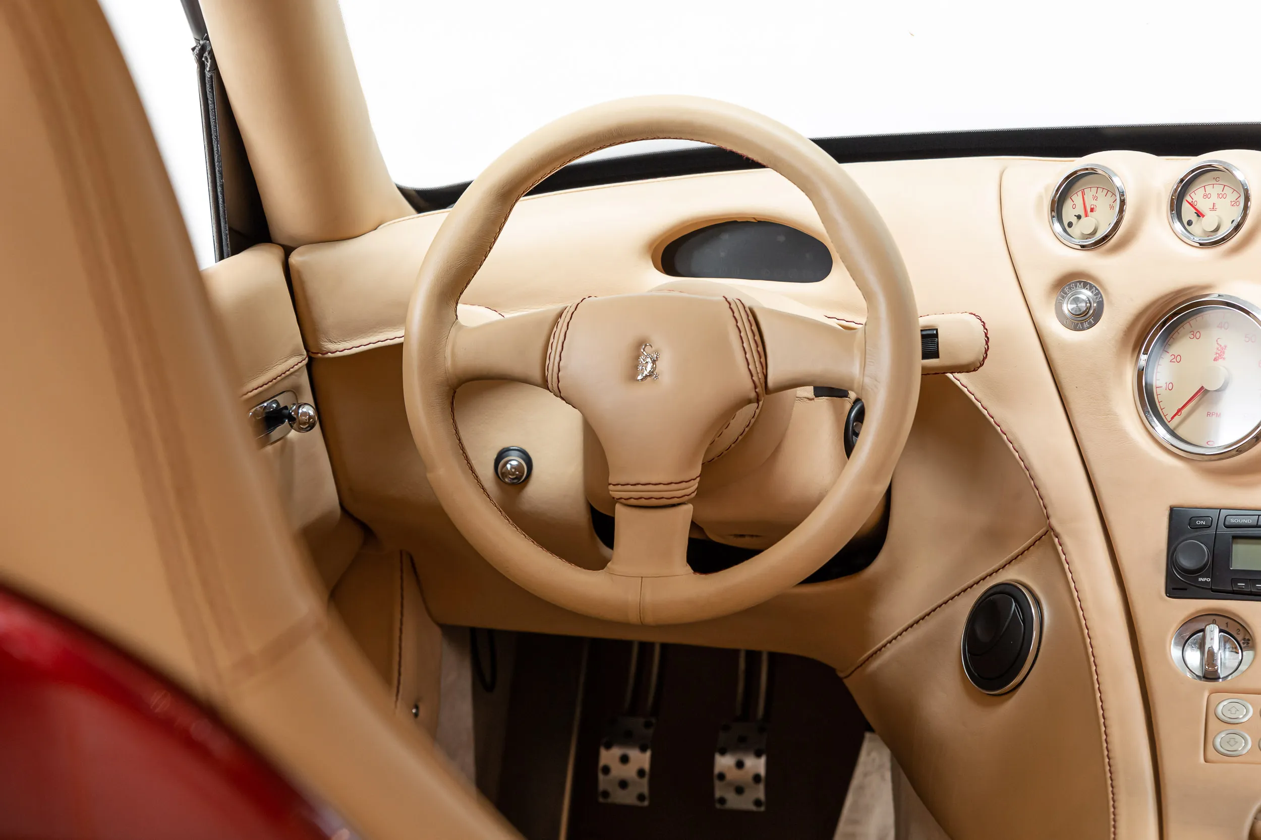 ¿Y la nuestra? Tal y como esperabais. El MF4 GT con un poco más de sexo. El MF4 significa el cuarto tipo, esta vez con el icónico V8 de 4,8 litros de BMW que conocemos del Alpina e60, por ejemplo. Está acoplado a una transmisión manual de seis velocidades, directamente a las ruedas traseras. Su pintura es una pintura "individual" con múltiples capas de negro y rojo, que cambia con cada luz. Por dentro, tiene el interior beige más exclusivo con costuras rojas y vacas extra. Ha sido mantenida en un concesionario BMW y sólo ha recorrido 14.000 km para que la gente estire el cuello.
